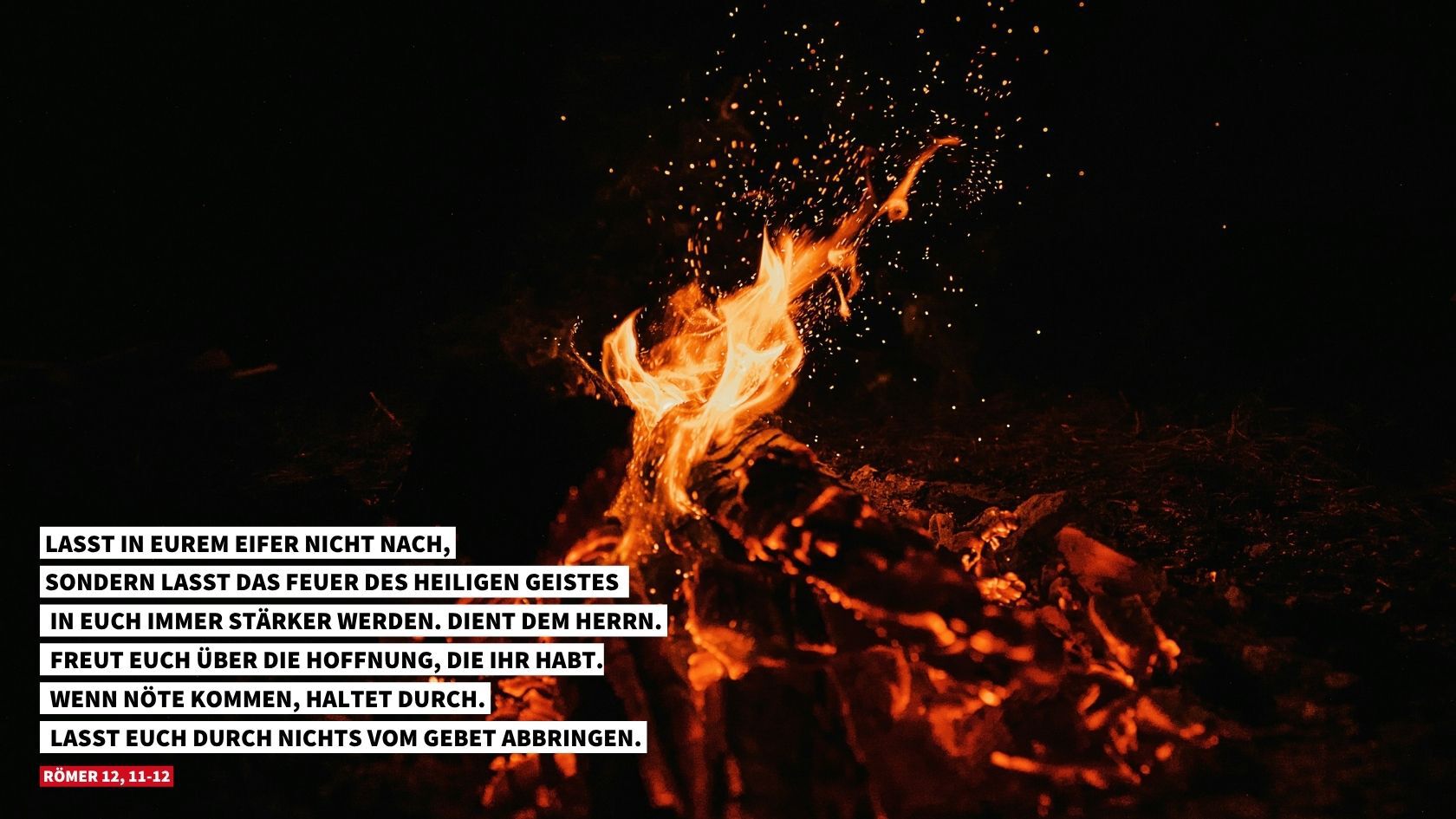„Lasst in eurem Eifer nicht nach, sondern lasst das Feuer des Heiligen Geistes in euch immer stärker werden. Dient dem Herrn. Freut euch über die Hoffnung, die ihr habt. Wenn Nöte kommen, haltet durch. Lasst euch durch nichts vom Gebet abbringen.“ (Römer 12, 11-12)